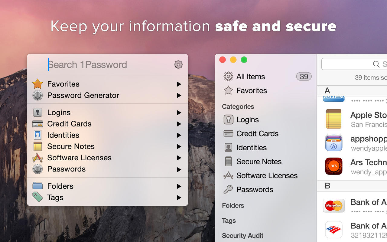 1Password is a popular tool for storing usernames, passwords, credit cards, addresses, notes, bank accounts, driver’s licenses, passports, and more behind one master password, with end-to-end encryption. A built-in password generator lets users create strong, unique passwords and memorizable pass-phrases.