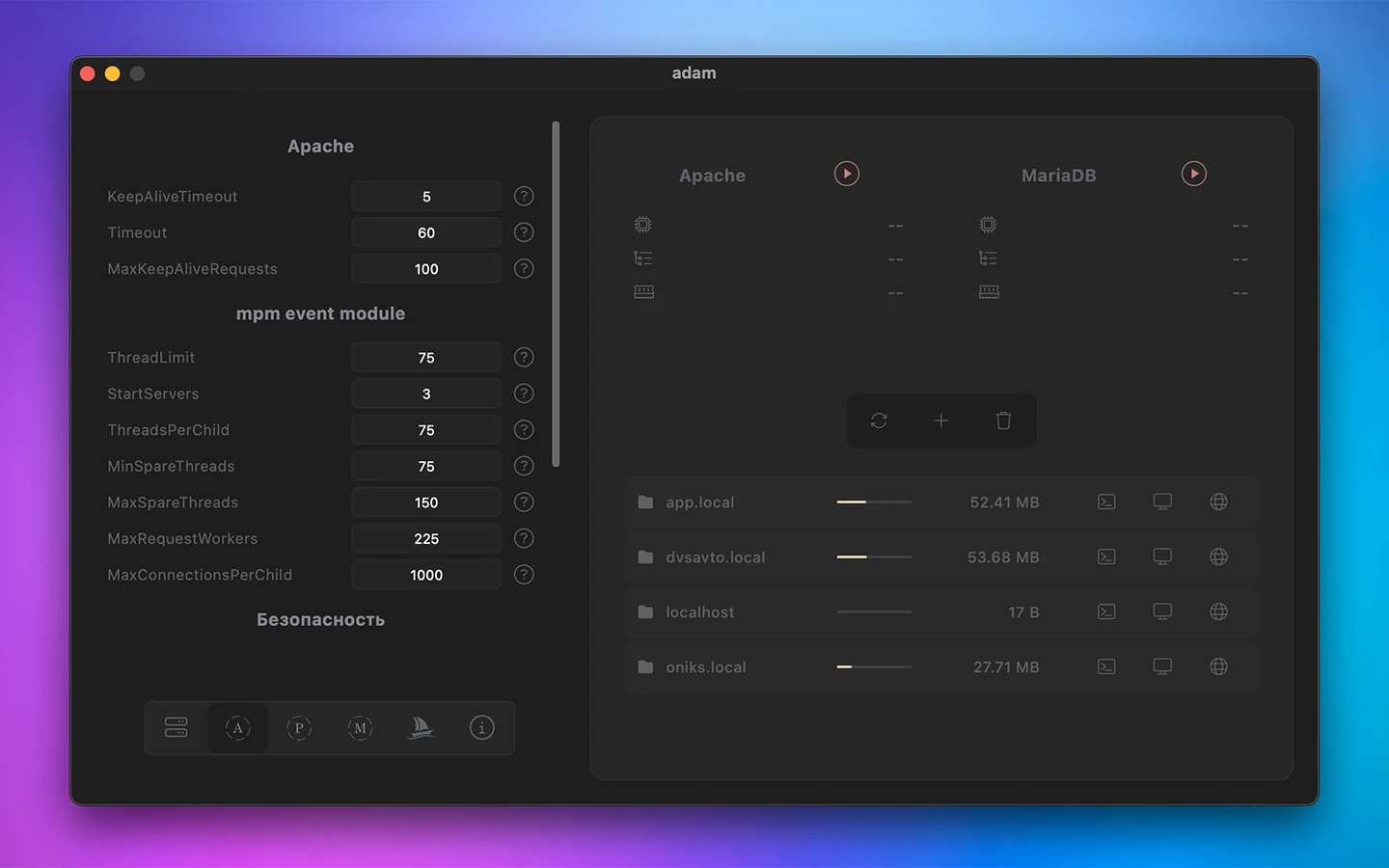 Applications Adam 3.7.0 by mac torrents August 25, 2025 August 25, 2025 ( Adam 3.7.0 )Loading... Download Adam is a lightweight, fast, and fully self-contained web server for developers who value stability, flexibility, and predictability in their environment. Built from scratch, without Homebrew, Docker, or external dependencies, Adam gives you a full LAMP stack (Apache, PHP, Mariadb) with fine-tuning and a graphical management interface – right out of the box. Why Adam? Completely isolated environment No system file will be damaged. Everything works within /Applications/Adam – clean and tidy. Custom build of all Apache components, PHP, Mariadb and all dependencies (OpenSSL, zlib, PCRE, etc.) are built manually so you know: no magic, just control GUI for launching and managing The built-in Tauri application manages the server: launching, restarting, viewing logs, configuration – everything is convenient and fast. Local domain support Built-in root agent allows you to configure localhost domains and etc/hosts without constantly asking for a password. Works without internet Ideal for freelancers, travelers and all cases when stability is above all else. What’s inside? Apache 2.4 (optimized build) PHP 8.4.8 (with extensions and libphp.so support) MariaDB 12.0.1 Ready project structure: config, server, www For whom? Web developers who are tired of broken environments Freelancers who need a reliable local server Enthusiasts who respect minimalism and cleanliness in systems Adam is your local Dev server that doesn’t need hacks. It just works. Fast. Stable. For a long time. Language: Russian , English , German , Chinese (simplified) , French , Japanese Compatibility: macOS 12 and later Screenshots Name: Adam 3.7.0_Mactorrents.Me.dmg Size: 425 MB Files Adam 3.7.0_Mactorrents.Me.dmg[425 MB] Download Torrent Download 0 comment TwitterRedditEmail mac torrents Mac Torrents - Torrents for Mac. Free Apps, Games & Plugins. Apple Final Cut Pro & Logic Pro X, Adobe Photoshop, Microsoft Office, Pixel Film Studios, previous post RunCat 12.2.1 next post Rectangle Pro 3.0.59