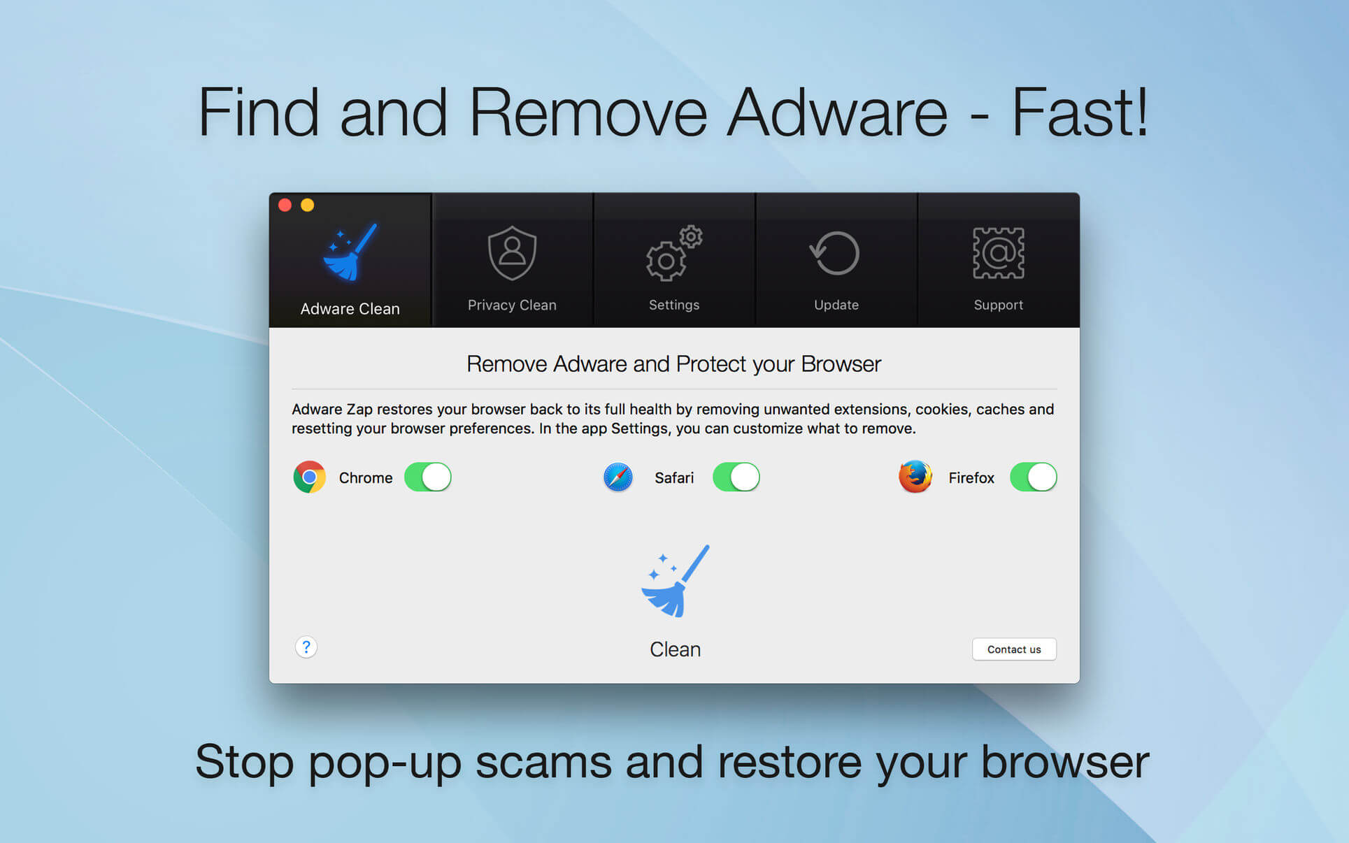 Adware Zap & Privacy Cleaner restores your browser back to its full health by removing unwanted extensions, cookies, caches and resetting your browser preferences. Adware Zap is your choice if: