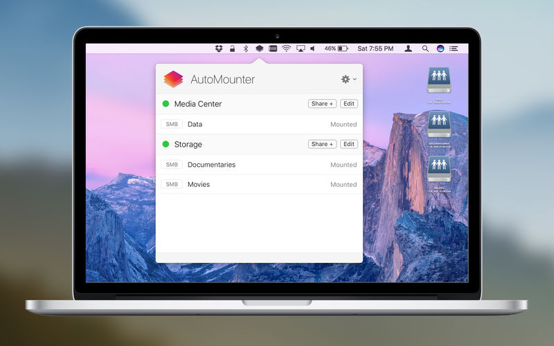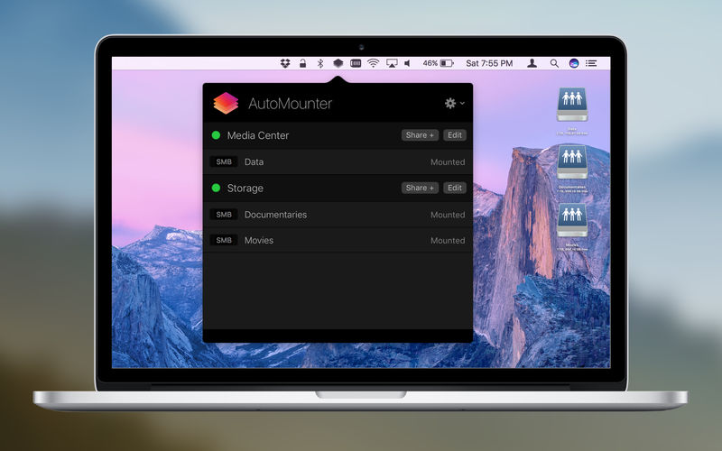 AutoMounter 1.7.1 May 1, 2021 , Application, Utilities Name: AutoMounter_1.7.1__HCiSO_Mactorrents.io.dmg Size: 12.5 MB Files AutoMounter_1.7.1__HCiSO_Mactorrents.io.dmg[12.5 MB] Download Tired of mounting your network shares? AutoMounter ensures that your shares are always mounted when you need them. AutoMounter is a sleek and powerful menu item designed to automatically mount your network shares. FEATURES Automatically Mounts SMB / AFP / NFS / WebDAV / (FTP is read-only) Quickly remounts shares if they unmount Supports multiple NAS appliances, with server discovery Advanced rule matching against WiFi SSIDs and more Wake On LAN to unavailable servers Dark Theme PRO SETTINGS (In-App Purchase) Open Apps and files when a share mounts Mount in /Volumes and other custom locations (requires Helper App) Export Settings to a Managed Profile What’s New: Version 1.7.1 Apple Silicon support Fixed Share reveal bug Fixed intermittent crash at first launch Compatibility: OS X 10.11 or later, 64-bit processor Mac App Store https://apps.apple.com/us/app/automounter/id1160435653 Screenshots
