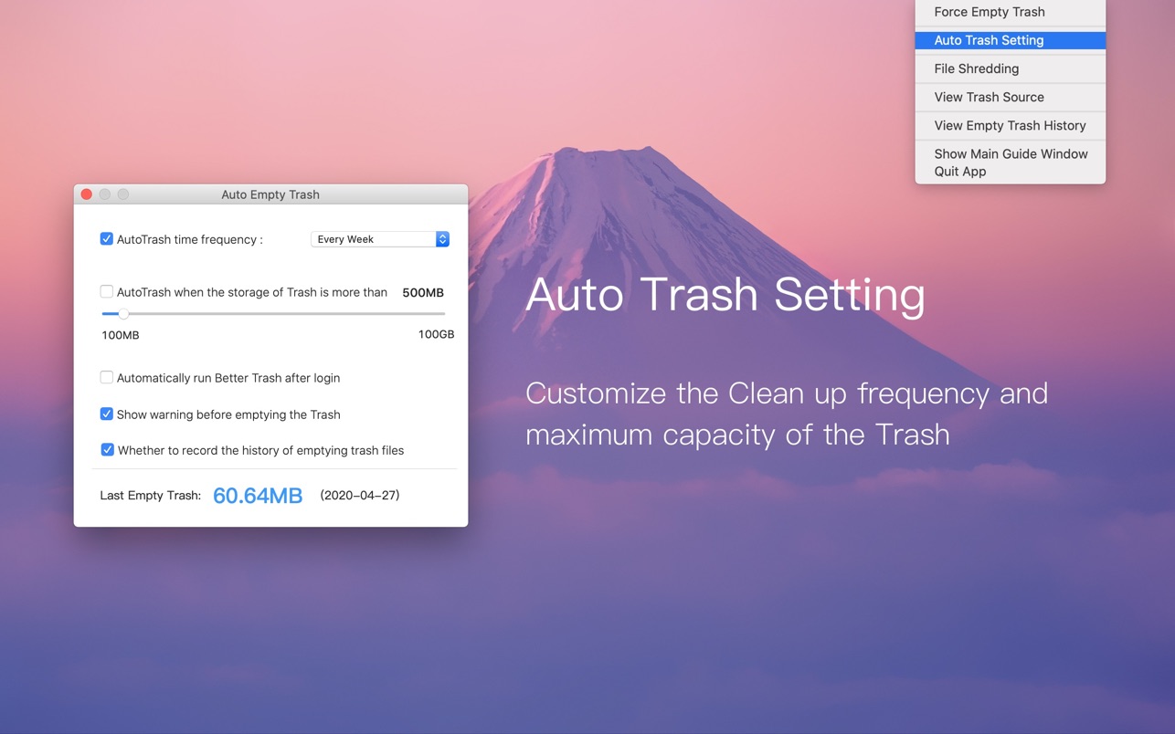 Better Trash is a trash manage app on macOS, it’s designed to help you solve problems that Trash can’t be emptied, clean up the trash automatically, view the original location of the trash item, and view the history record of emptying trash with Better Trash.