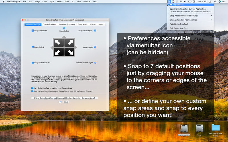 BetterSnapTool allows you to easily manage your window positions and sizes by either dragging them to one of your screens corners or to the top, left or right side of your screen. This lets you easily maximize your windows or position them side by side. In addition, you can set keyboard shortcuts in order to move and resize your windows the way you want.
