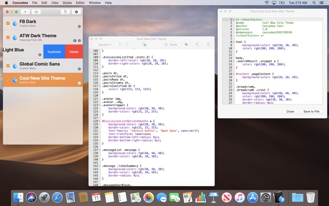 Cascadea is also an incredibly powerful tool for CSS developers, whether you’re writing custom styles of your own or using it as part of your web development workflow. Cascadea includes a fully-featured code editor for writing custom stylesheets, with support for autocompletion, syntax highlighting, automatic indentation, code folding, beautification, multicursor support, and more. Choose between multiple color themes for the editor, open multiple styles in tabs, and watch Safari update live when you save changes. Plus, if you prefer your own code editor, you can easily export and import a standard CSS file into and out of Cascadea.