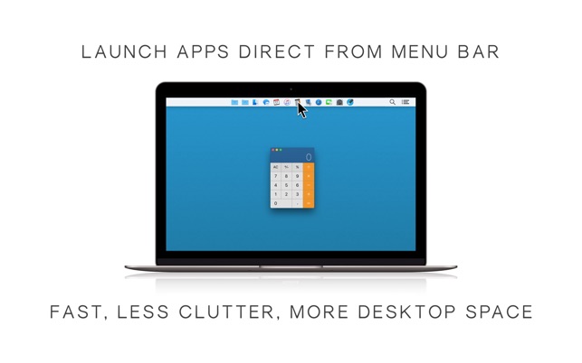 • Launch or switch apps, browse folders and open files with a single click • Add your essential apps, files and folders in the bar as icon or menu item • Browse folders without opening and closing Finder windows • Copy apps and folders automatically from the Dock to the bar • Free up desktop space by hiding the Dock • Colored or grayscale bar icons, regular and retina screens • Use customizable keyboard shortcuts • Hold the Cmd key down to drag Menu Bar icons, left/right to reposition, down to remove