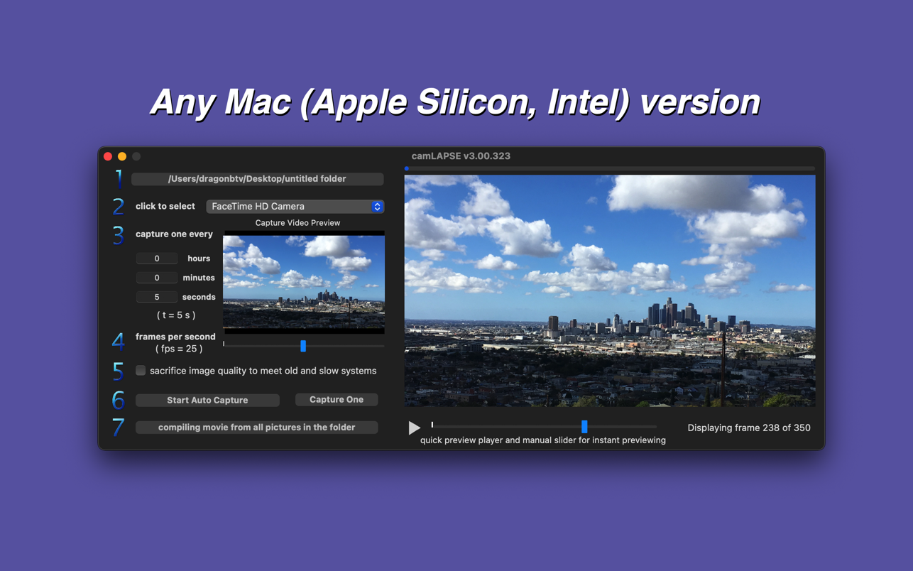 timeLAPSE will take a silent screenshot of your Mac’s desktop automatically and periodically at an interval according to your setup, from between 10 seconds to 24 hours. All captured screenshots will be saved in a folder of your choosing. Then, these captured screenshots can be linked and compiled into a continuously played time-lapse video at any time.