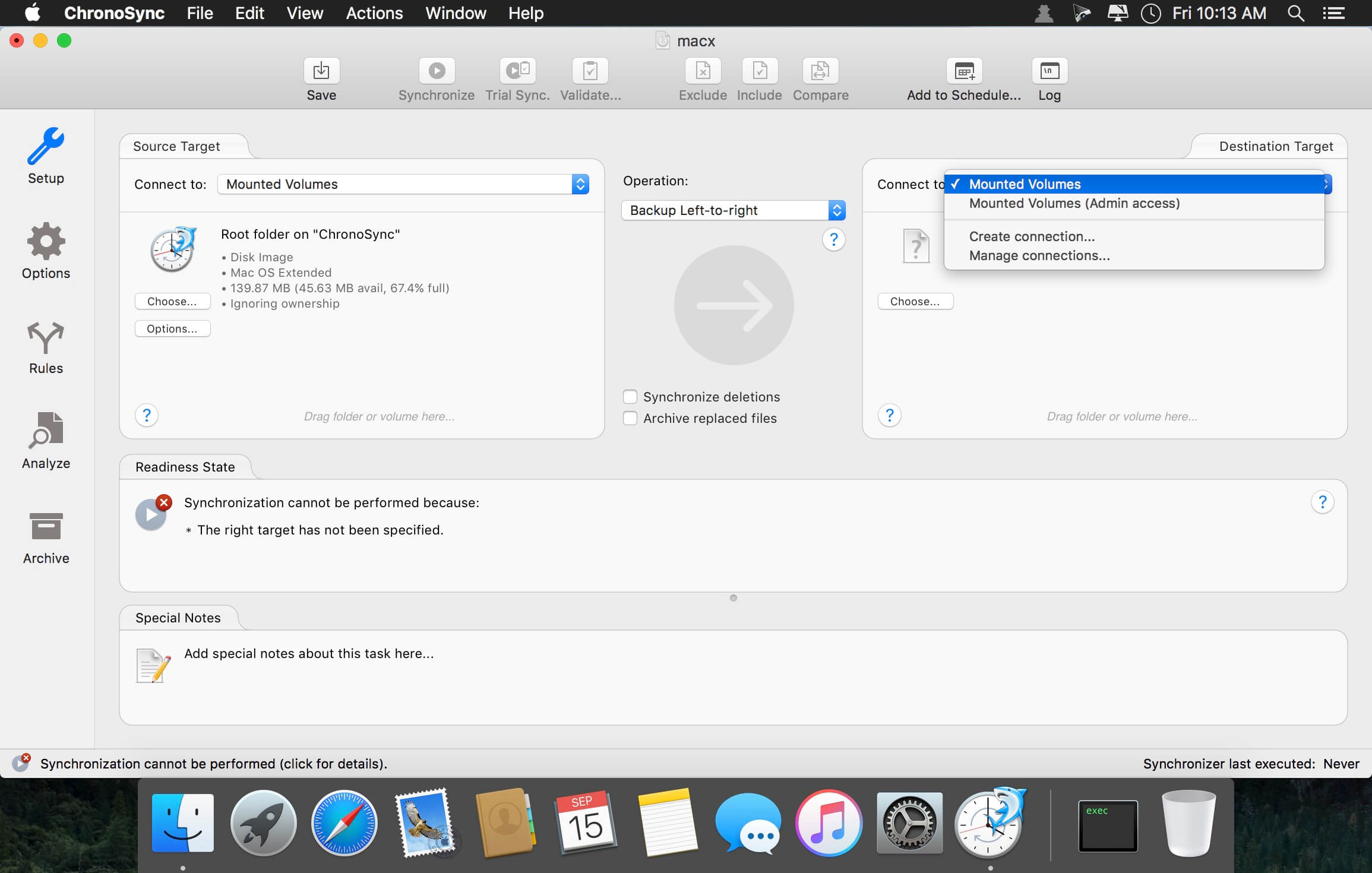 With ChronoSync can sync or do a backup for most devices and directories, and all that can be connected to the Mac, including a folder on your Mac, other Macs, PCs and external drives. Possibilities: • Fully customizable toolbar • All settings are stored in separate files that can be edited at any time • Synchronization in two directions • drafting rules to filter the files by various attributes • Compare files before sync • Run a test to verify the results of synchronization before performing operations • history of synchronization, which can be printed or saved to a file • Automatic synchronization on a schedule • Use AppleScripts to automate synchronization.