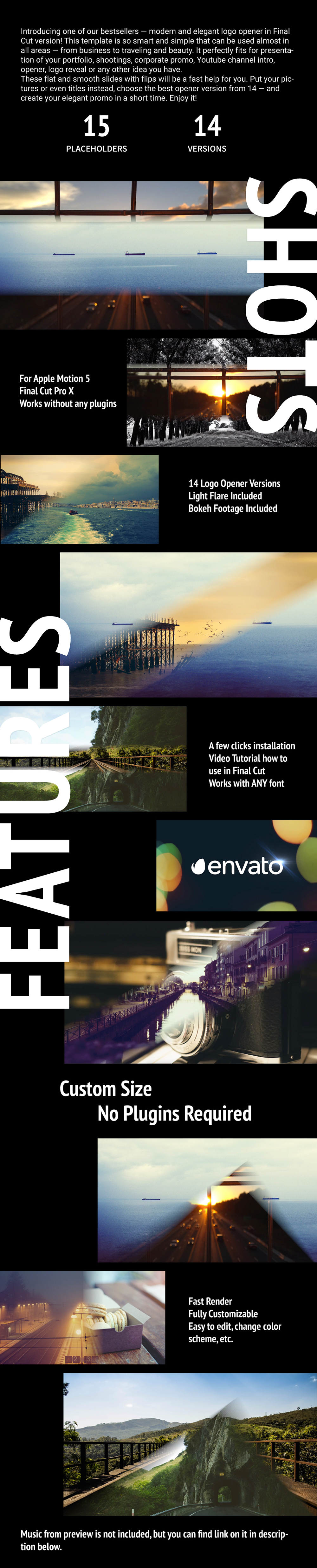 Here is a modern and elegant logo opener. This Final Cut / Motion Template is suitable for any photography business, portfolio, shootings, corporate promo or any kind of presentation. Very useful for photographers, you might have what to present in your cameras displays or it can help to identity your gallery or channel. It’s perfectly fits for your intro, opener, logo reveal or any idea you have. These flat and smooth slides with flips will be a fast help for you. you can change the pictures or even put titles instead, It’s simple and takes a short time. Minimal work, but many variations, 14 Logo Opener Versions and 15 Placeholders. Hope you enjoy. And don’t forget to rate!
