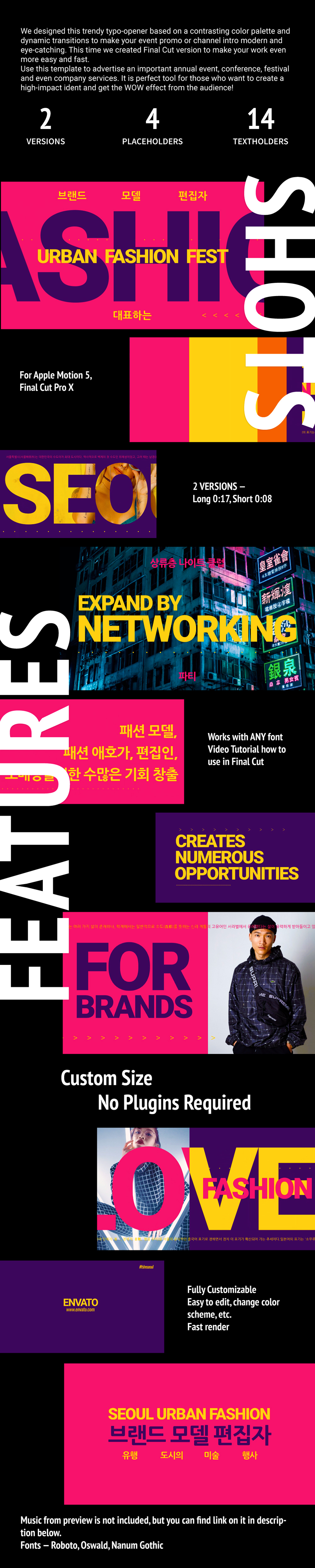 We designed this trendy typo-opener based on a contrasting color palette and dynamic transitions to make your event promo or channel intro modern and eye-catching. This time we created Final Cut version to make your work even more easy and fast. Use this template to advertise an important annual event, conference, festival and even company services. It is perfect tool for those who want to create a high-impact ident and get the WOW effect from the audience!