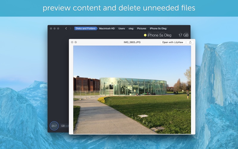 Hit Space to quickly preview file content, without launching another application. In this way, walk around your disk and drag-and-drop all unneeded files into the “collector”. Expand the collector to check its contents. When done, clean it up with a single click.