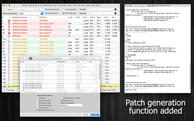 OTHER FUNCTIONS: – Syntax highlight – Theme color – Export to zip file – User can compare hidden files, folder (example: .git folder) – Allow to merge binary-plist file – In edit mode, a small view is show to the exact text difference
