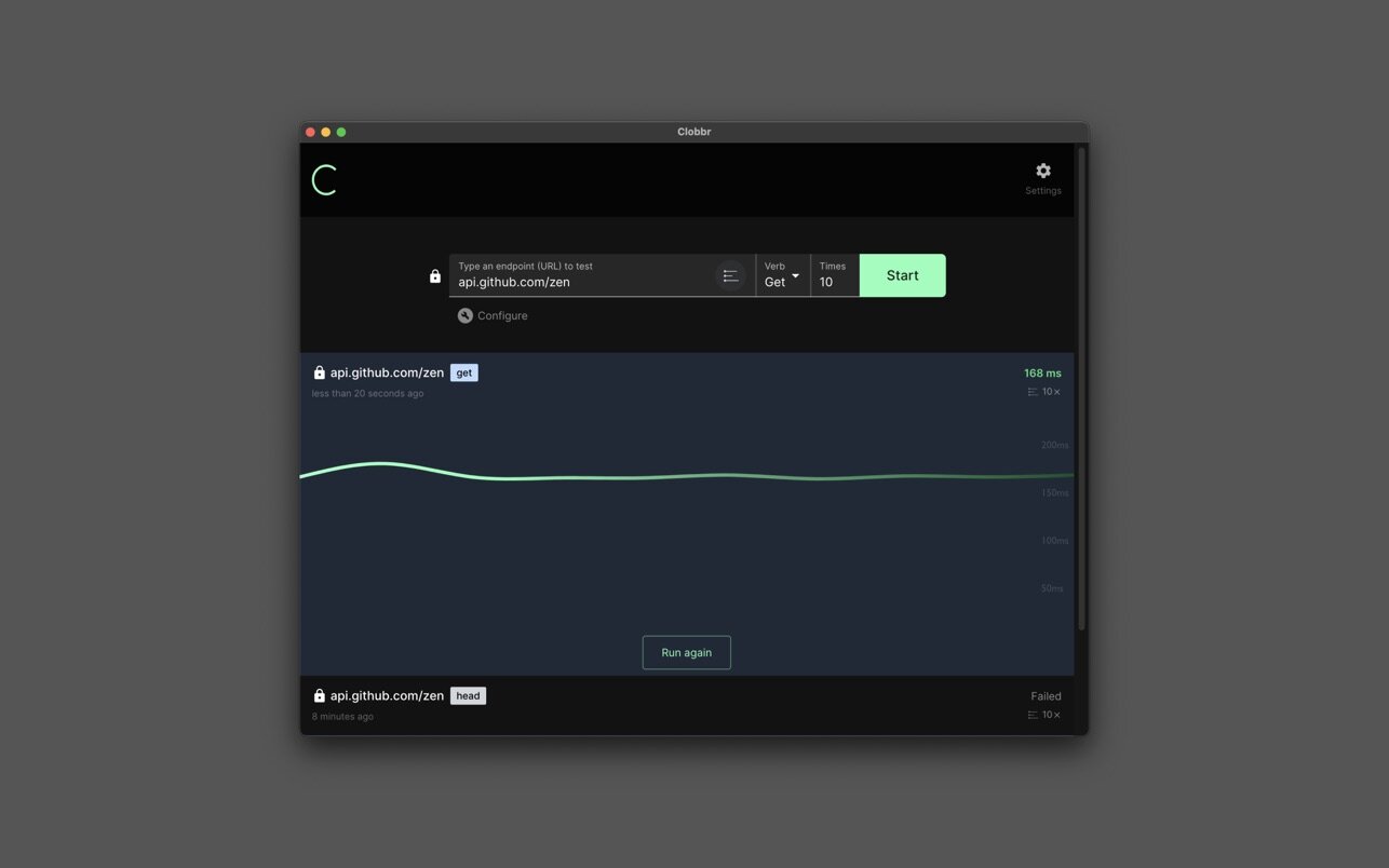 Clobbr is a developer tool that allows you to test your api endpoints to see how well they perform under multiple requests (clobber your apis!), in sequence or parallel.