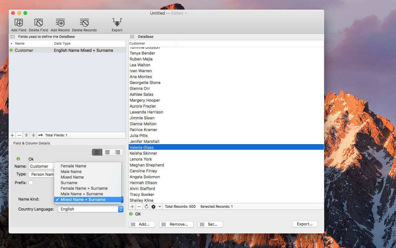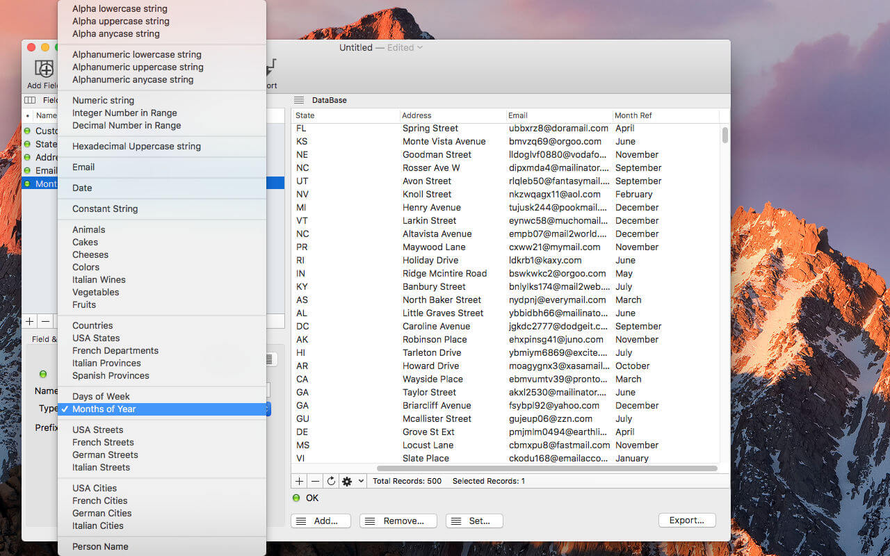 Created data can be heterogeneous, various and absolutely realistic, thanks to a large internal database of data to create dataset that looks true during demonstration and usage test. It uses an intuitive Mac OS X interface any Mac user is able to use from the first launch.