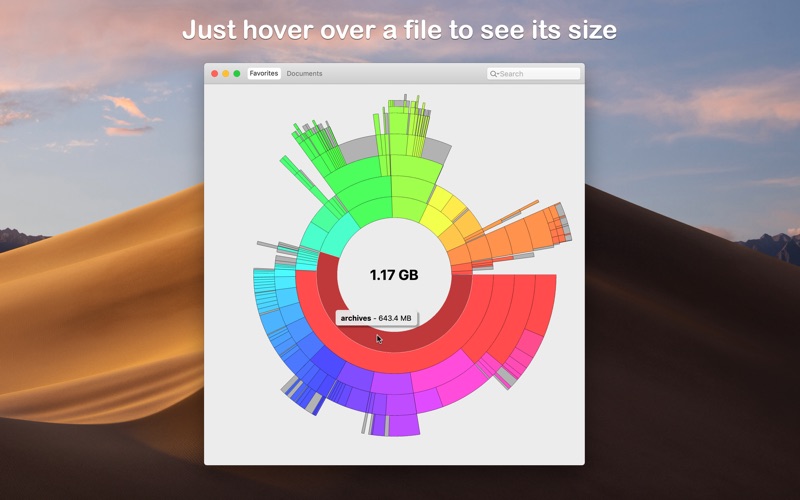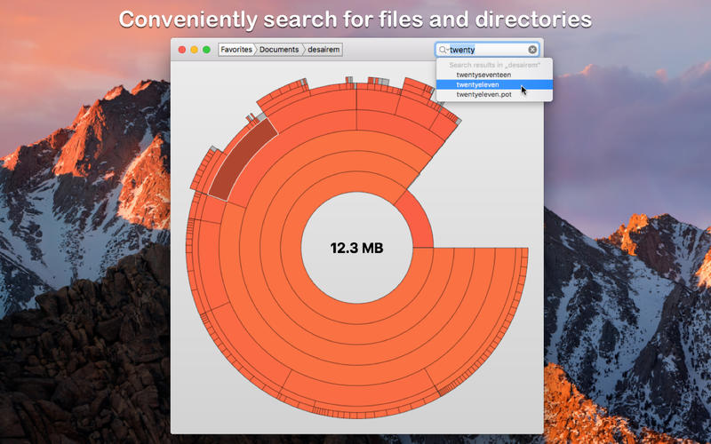 Features of DiskGraph include: ● any directory reachable in the Finder (i.e. on your local machine, on an external drive or even on a remote server) can be selected and immediately analyzed ● freely navigate inside the subdirectories of an analyzed folder or device ● smooth animations manage the transitions between selected directories ● move the mouse over a file to see its name and size ● use the context menu to trash selected files ● quickly search for filenames ● save your favorite locations and access them with one click from the main window.