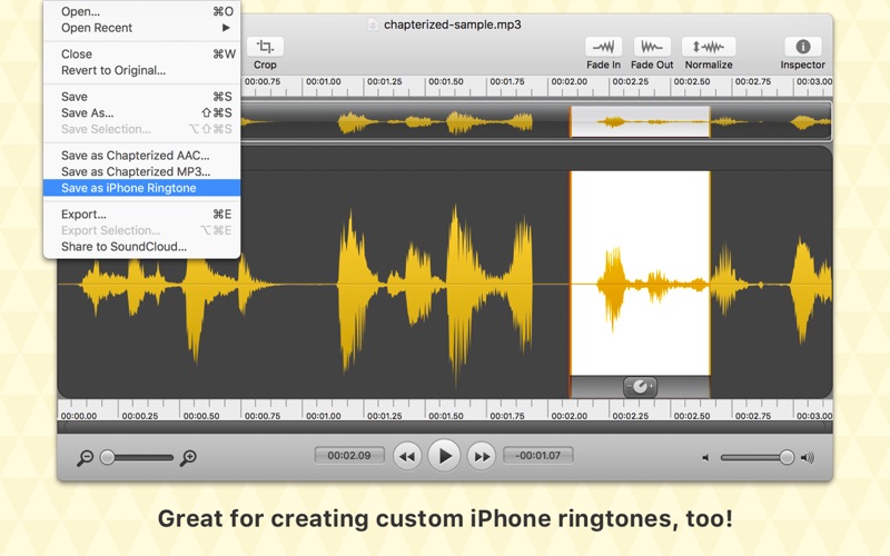 iPhone Ringtones: Edit audio down, then choose “Save as iPhone Ringtone” to get ringtones & text tones for the iPhone.