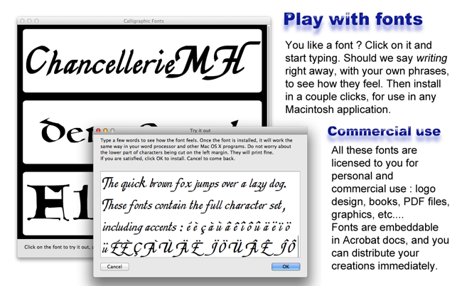 PLEASE NOTE: The fonts are not automatically installed when you install the application. You need to open Premium Fonts from your Applications folder and then click the Copy Files button in the main window to save the folder of fonts to a location on your computer. The PDF book is in the folder that is copied to your computer. Download the Webfonts versions from the Webfonts menu option. Refer to the Support page on our website if you need help using Webfonts: http://macappware.com/support/