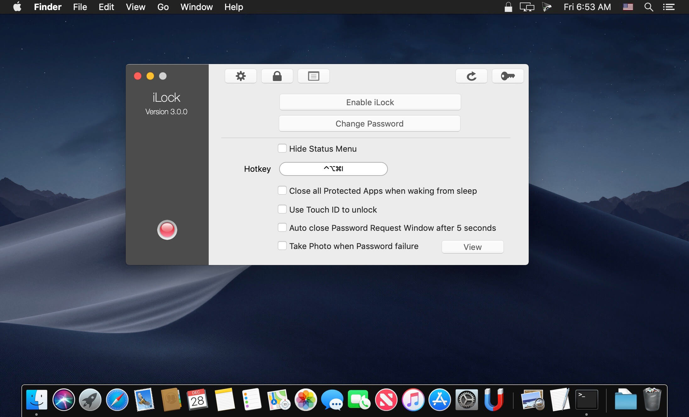 iLock password-protects any macOS application from unauthorized usage without modifying anything in your system settings and/or applications. It is safe to use!