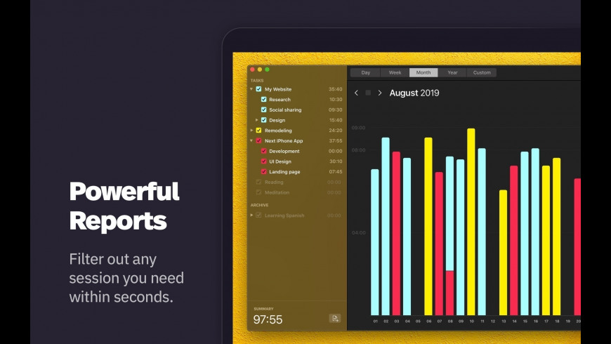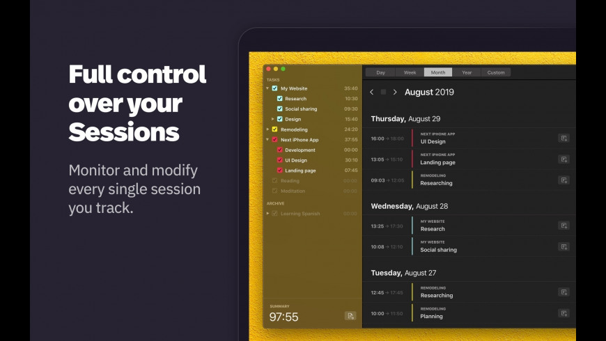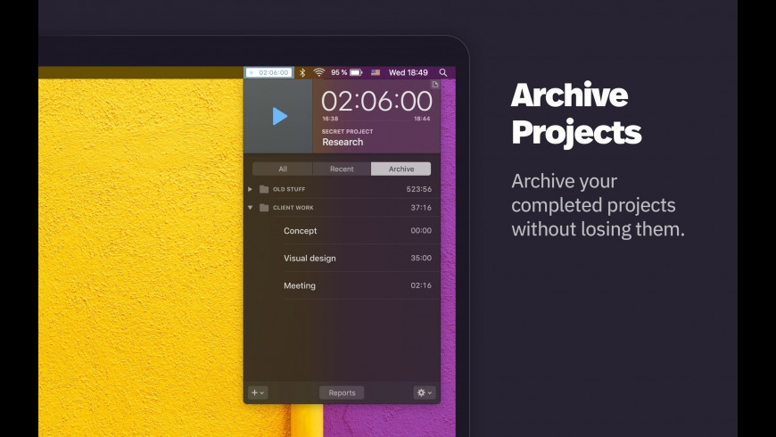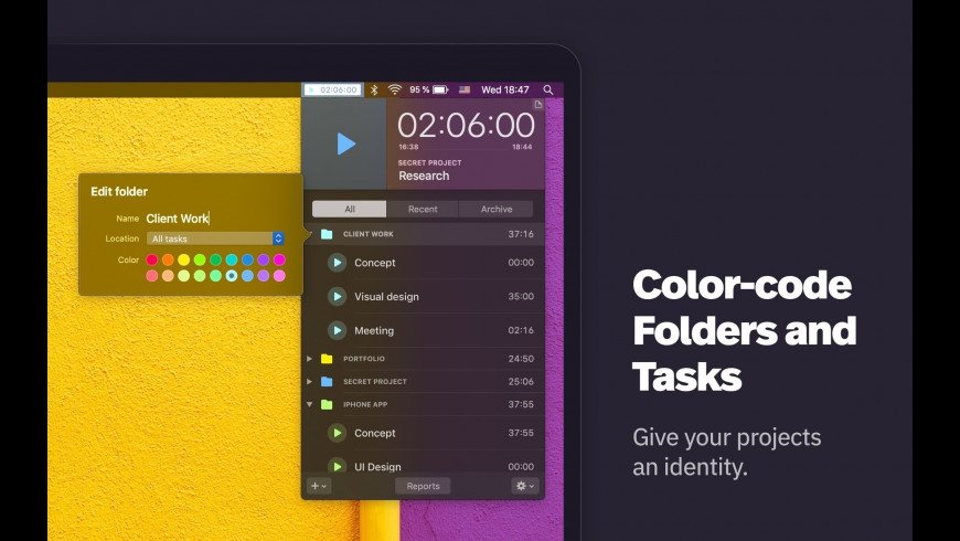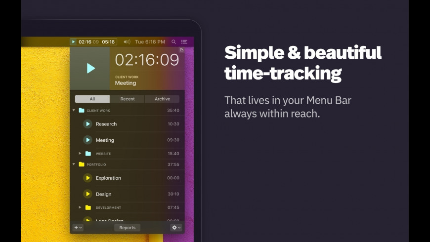 Mini Tracker: Control your session and time directly from the menu bar, without even opening the timer.