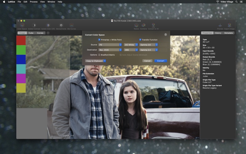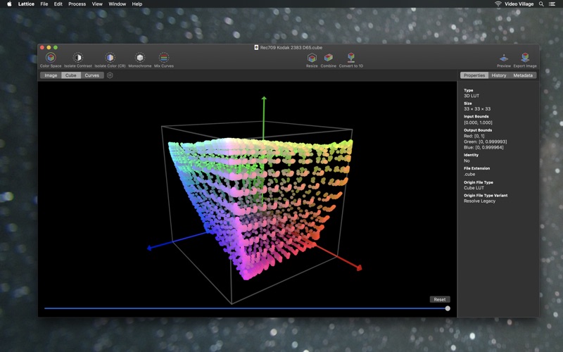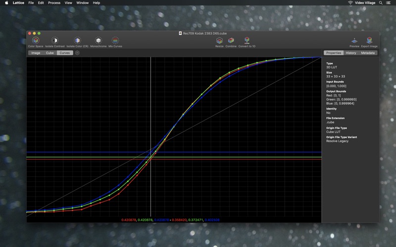 Lattice allows you to manipulate, transform, and convert 3D and 1D LUTs. Supports many popular LUT formats, and can seamlessly convert between any of them.