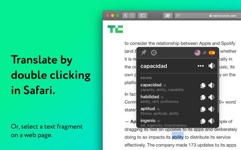 • Don’t navigate to translation websites anymore when you’re reading an article in Safari or editing a document in Pages. Just use Mate everywhere you go!