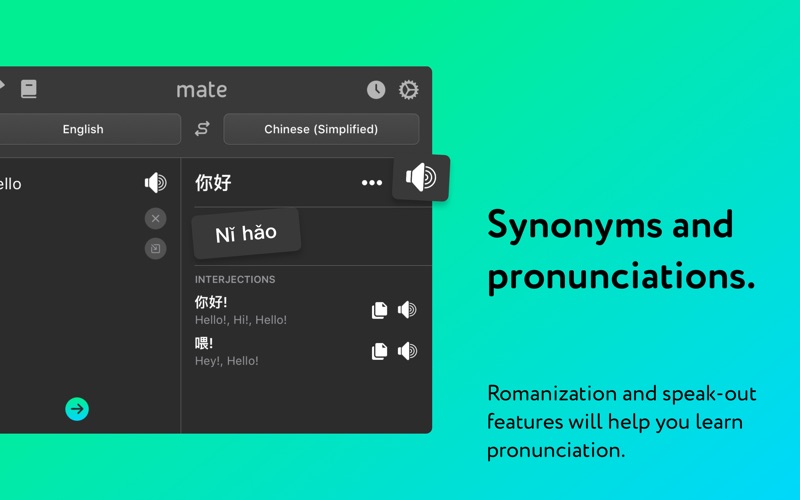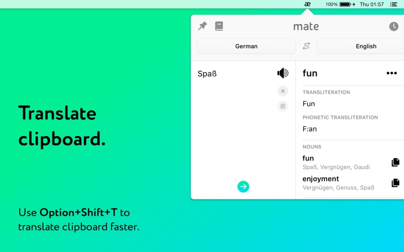 Stop tabbing to translation websites and start using Mate! Select text in any app and translate it. Join the other 550,000 users worldwide that are already using Mate.
