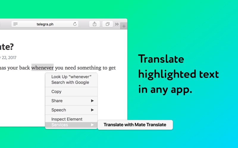 Stop tabbing to translation websites and start using ! Select text in any app and translate it. Join the other 550,000 users worldwide that are already using Mate.