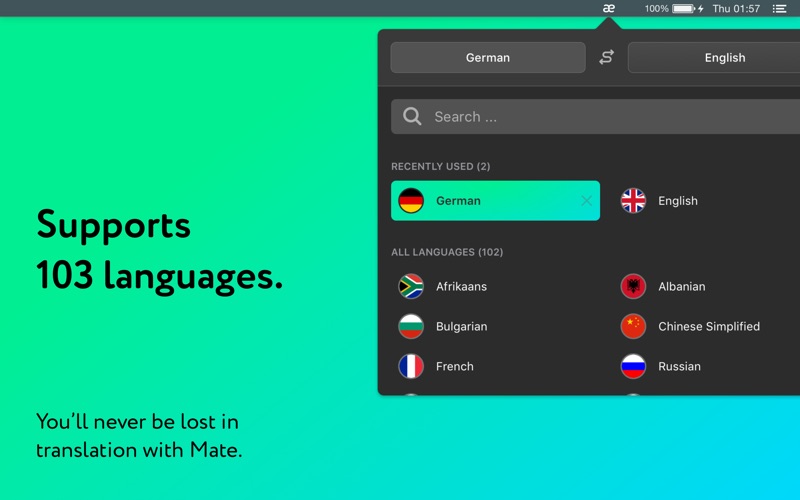 • Select any text in any app and get a translation by hitting the “Translate with Mate“ button in the context menu.