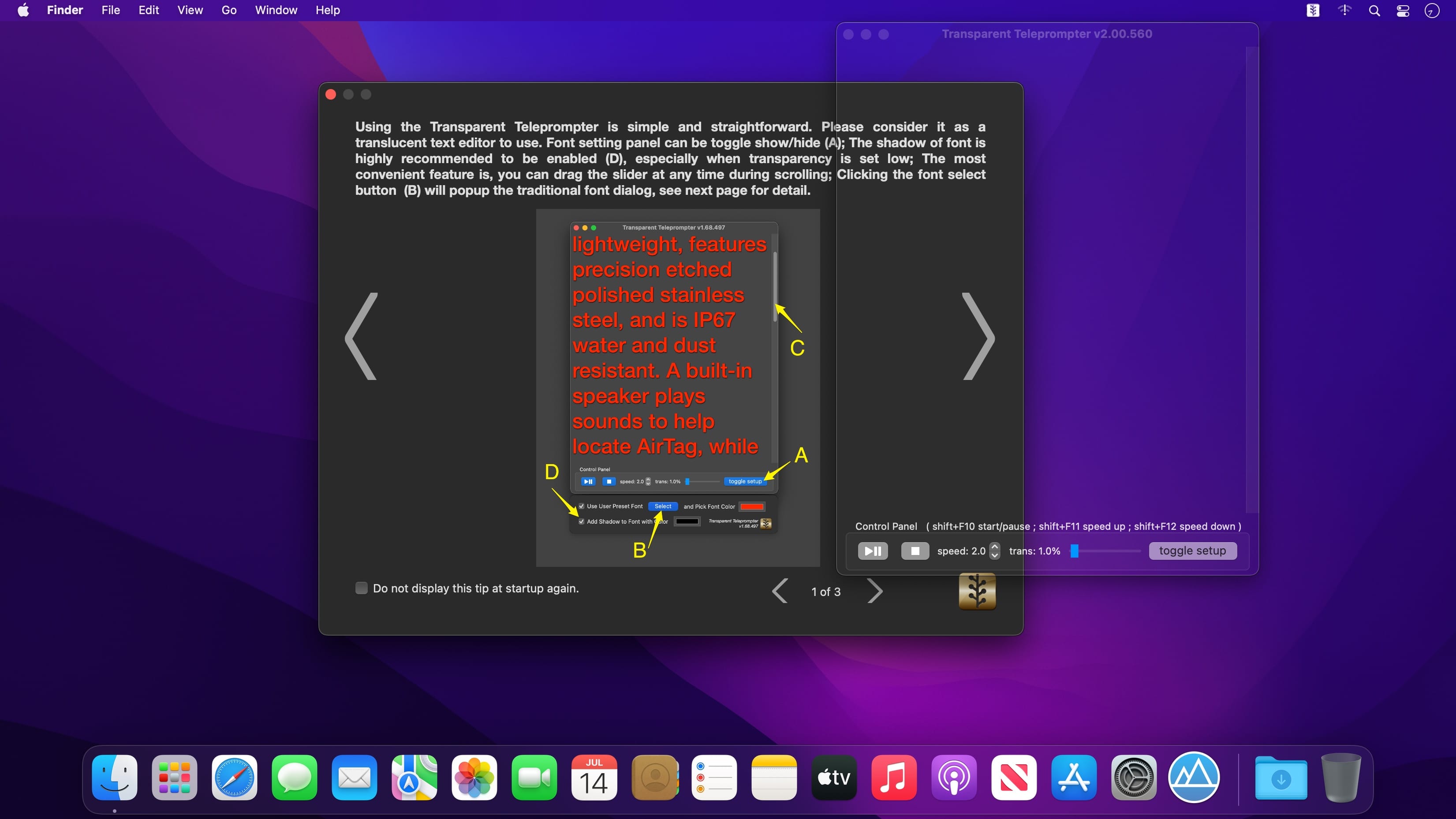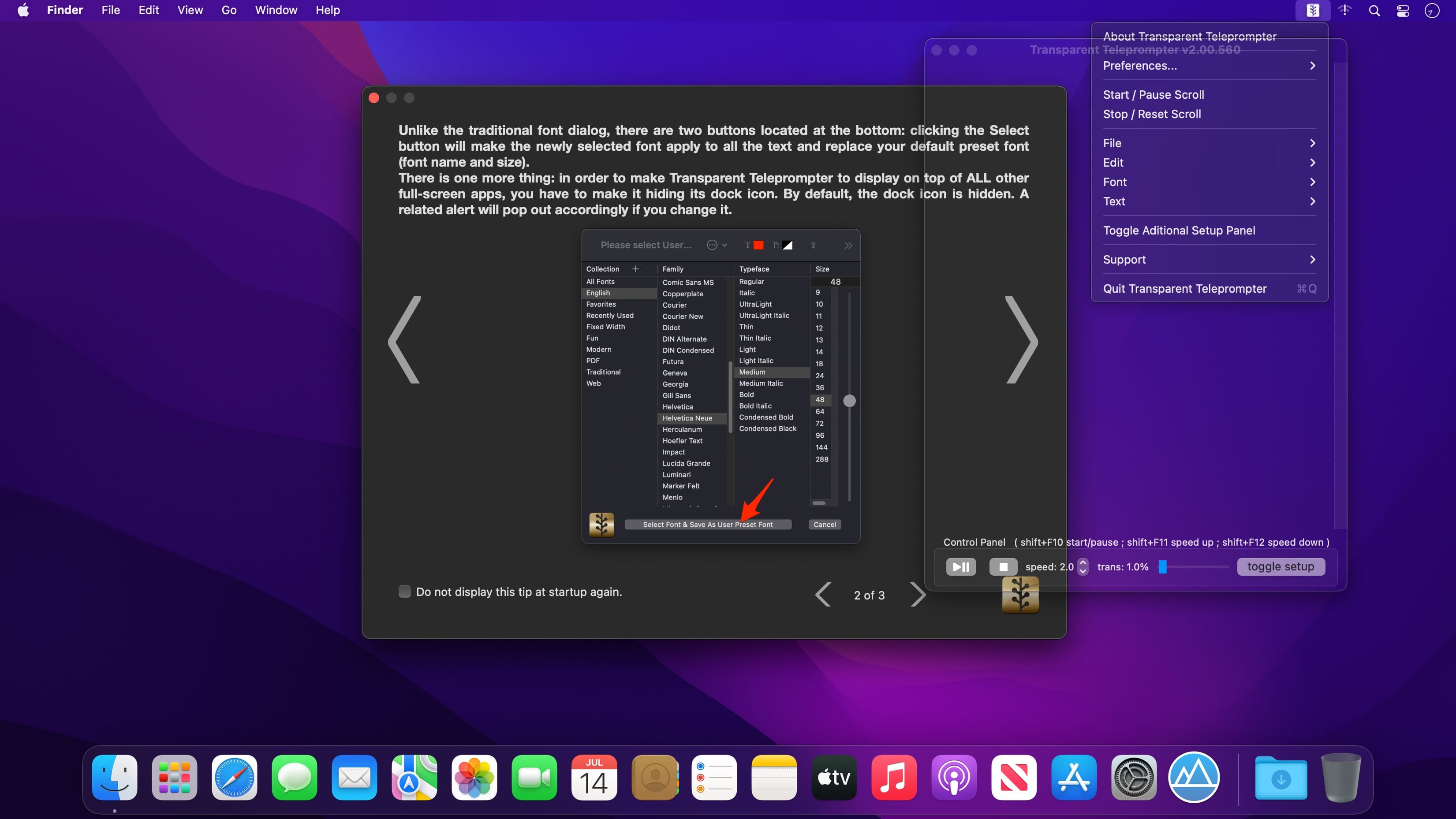 A translucent professional scrolling teleprompter overlay that can even show up on top of all your full-screen apps!
