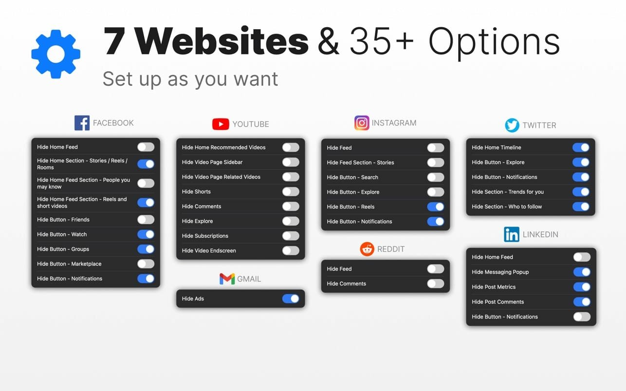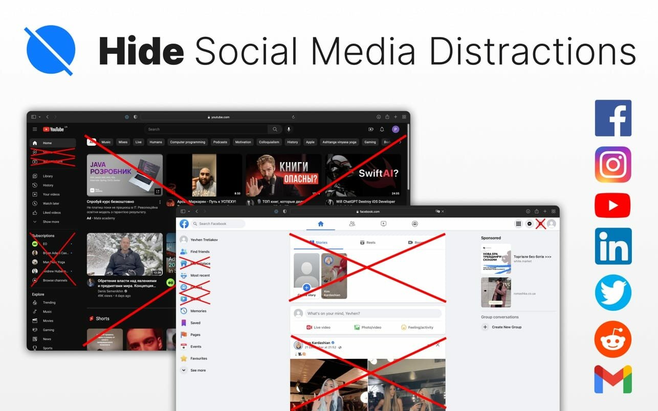 This Safari extension will become an assistant in your pursuit to control the time we spend every day in infamous time-sinks: Facebook, Instagram, YouTube, Twitter, Reddit, LinkedIn and Gmail.