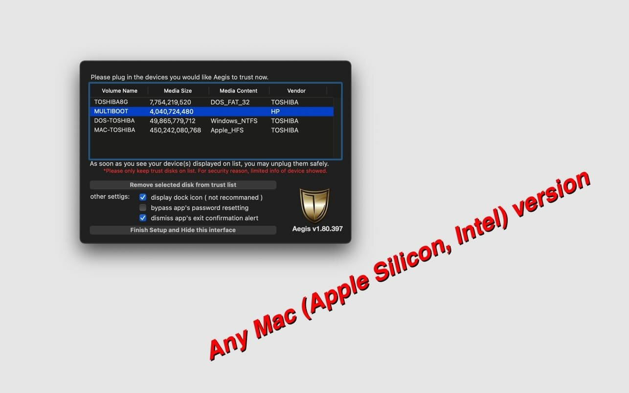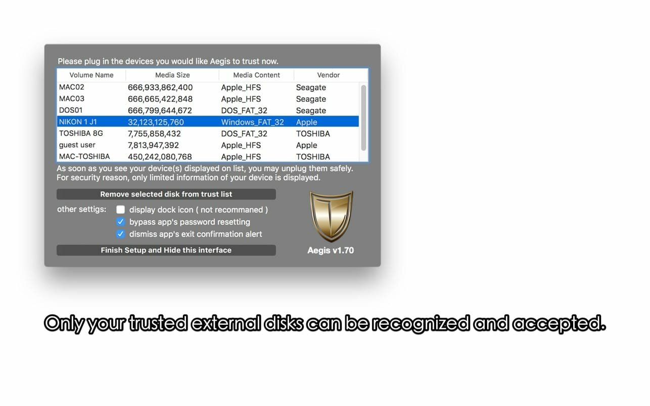 To make your Mac truly safe, Aegis itself is password-protected, and your white list is saved in data mode to prevent it from being altered. Aegis also grabs as much information and parameters from your disk as possible, so no clones can cheat it. And, unlike similar apps, Aegis will not write anything onto your devices.