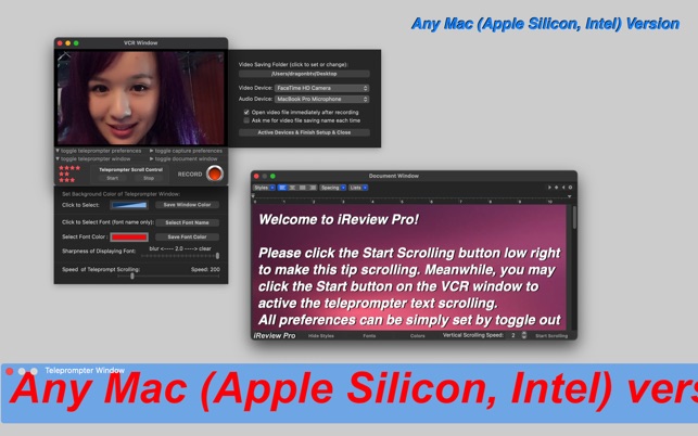 – Independent, movable, and re-sizable windows for both the Teleprompter and the Recorder;