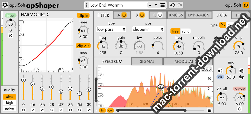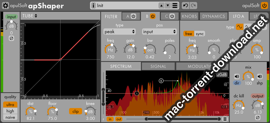 apulSoft apShaper is an audio insert effect plugin to add harmonic content to audio signals. It combines a waveshaper with three filter bands and various modulation options – two lfos, a dynamics detector and user-configurable knobs.