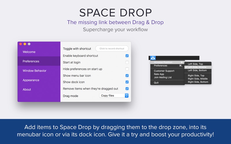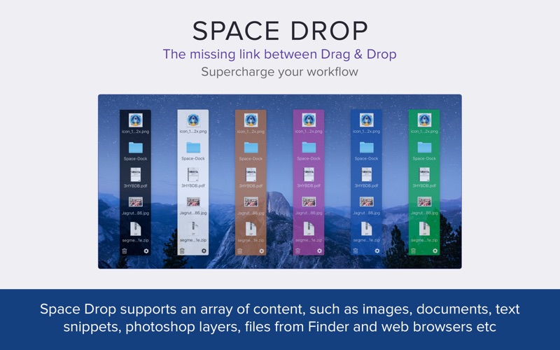 Easy drag & drop file management. Space Drop makes dragging and dropping files much easier with a handy dock that instantly appears whenever you start dragging a file. It creates a temporary place for you to store your files whilst you navigate to where they need to be dropped