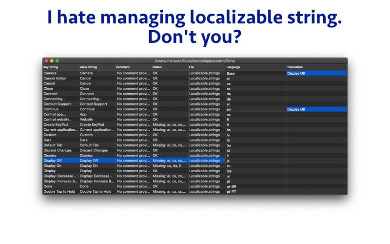 Hate doing localization for your project? Now you can hate it a little less:Save tons of money by doing automatic translation using strings from your other projects you have already paid for. See all the strings from all your files in your project in one simple and intuitive view. Hide fully translated strings to focus on what matters.