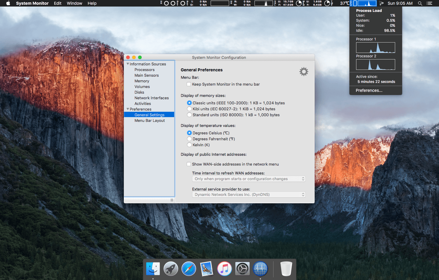 Keep track of all your system loads. This includes CPU load, memory usage, network speeds and -traffic and the open network connections. All information can be shown in both the menu bar extra and the overlay window. Use the Dashboard to take a look at the most important parameters.