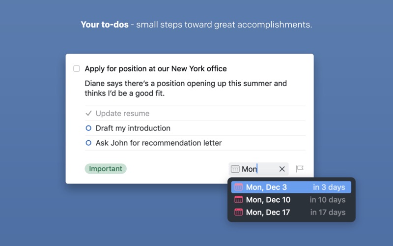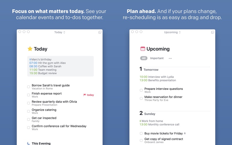 • Plan Your Time – See your calendar events alongside your to-dos and plan your time effectively. Create repeating to-dos for things you do every few days, weeks, or months – Things will remind you on the right day.