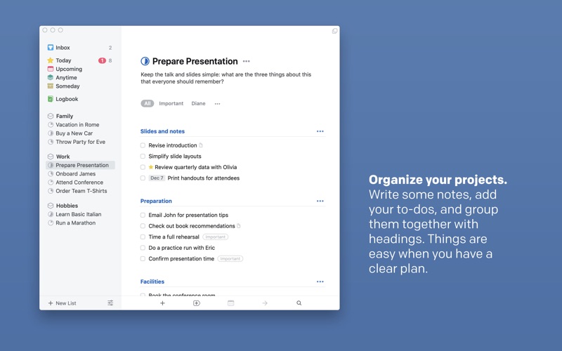 • Teamwork. Things offers convenient collaboration features. Easily delegate tasks to members of your team. (This is work in progress.)