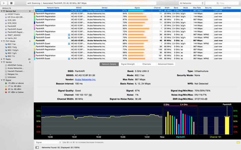 WiFi Explorer Pro takes the code base of WiFi Explorer, and adds a set of features that makes it the right tool for WLAN and IT professionals. You can use WiFi Explorer Pro for preliminary assessments, to help design and validate wireless networks installations, as well as to identify channel conflicts, overlapping, poor signal quality and other issues that may be affecting the connectivity or performance of your home, office or enterprise wireless network.