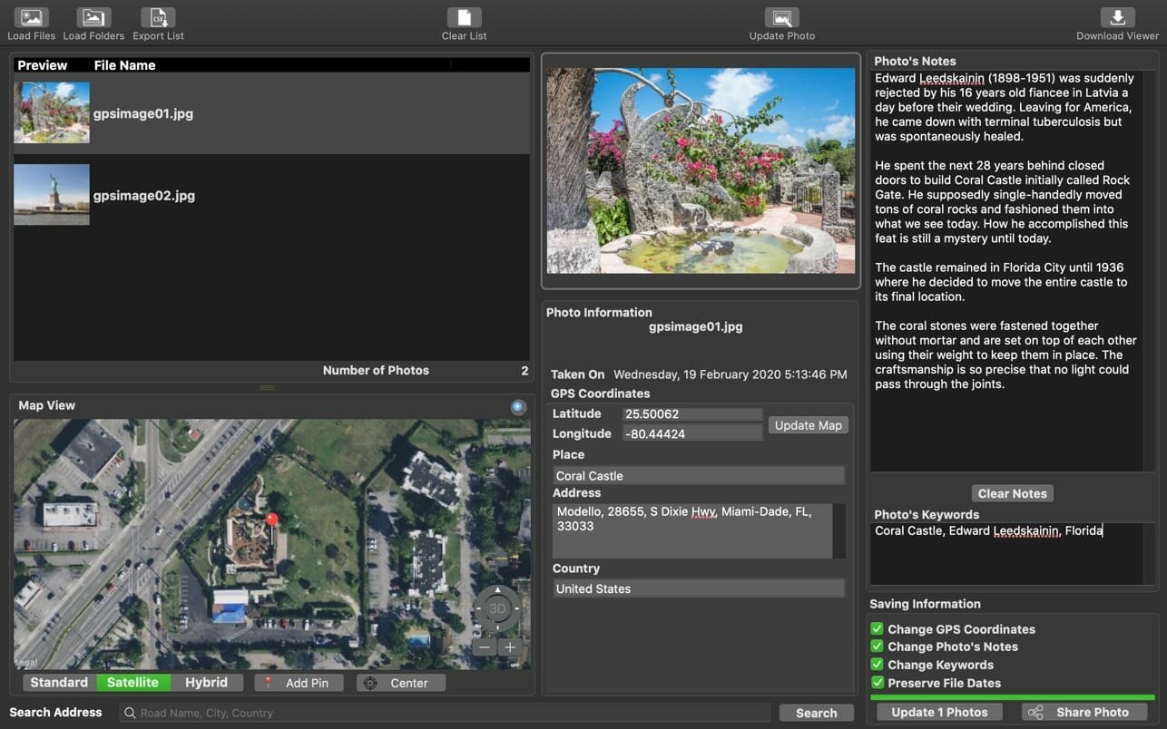 • Filter files by GPS distance or by GPS altitude (ie: drone photos). Measure distance between two photos based on embedded GPS coordinates.