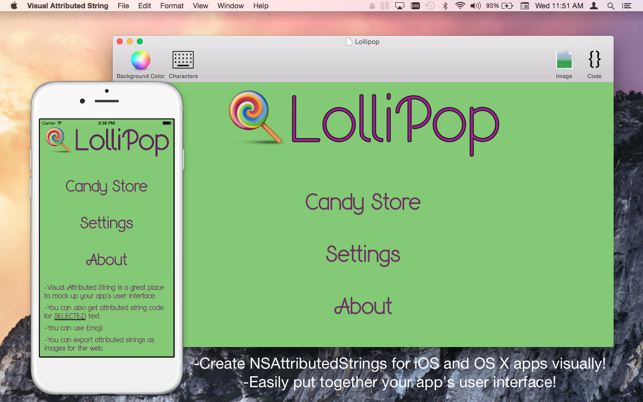 Includes Label Maker™! Click the “embed in label” option to generate code to create a label using the attributed string you visually designed (the code will generate a UILabel for iOS and NSTextField for OS X)!