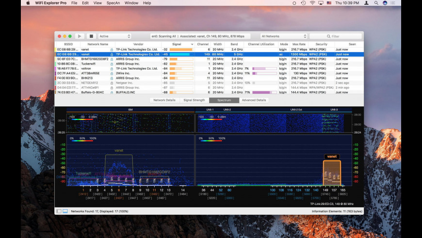 WiFi Explorer Pro takes the code base of WiFi Explorer and adds a set of features that makes it the right tool for WLAN and IT professionals. You can use WiFi Explorer Pro for preliminary assessments, to help design and validate wireless networks installations, as well as to identify channel conflicts, overlapping, poor signal quality and other issues that may be affecting the connectivity or performance of your home, office or enterprise wireless network.