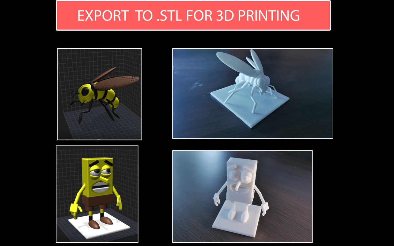 Export your Claydo creations to a 3d printer or external apps like Maya and Blender.