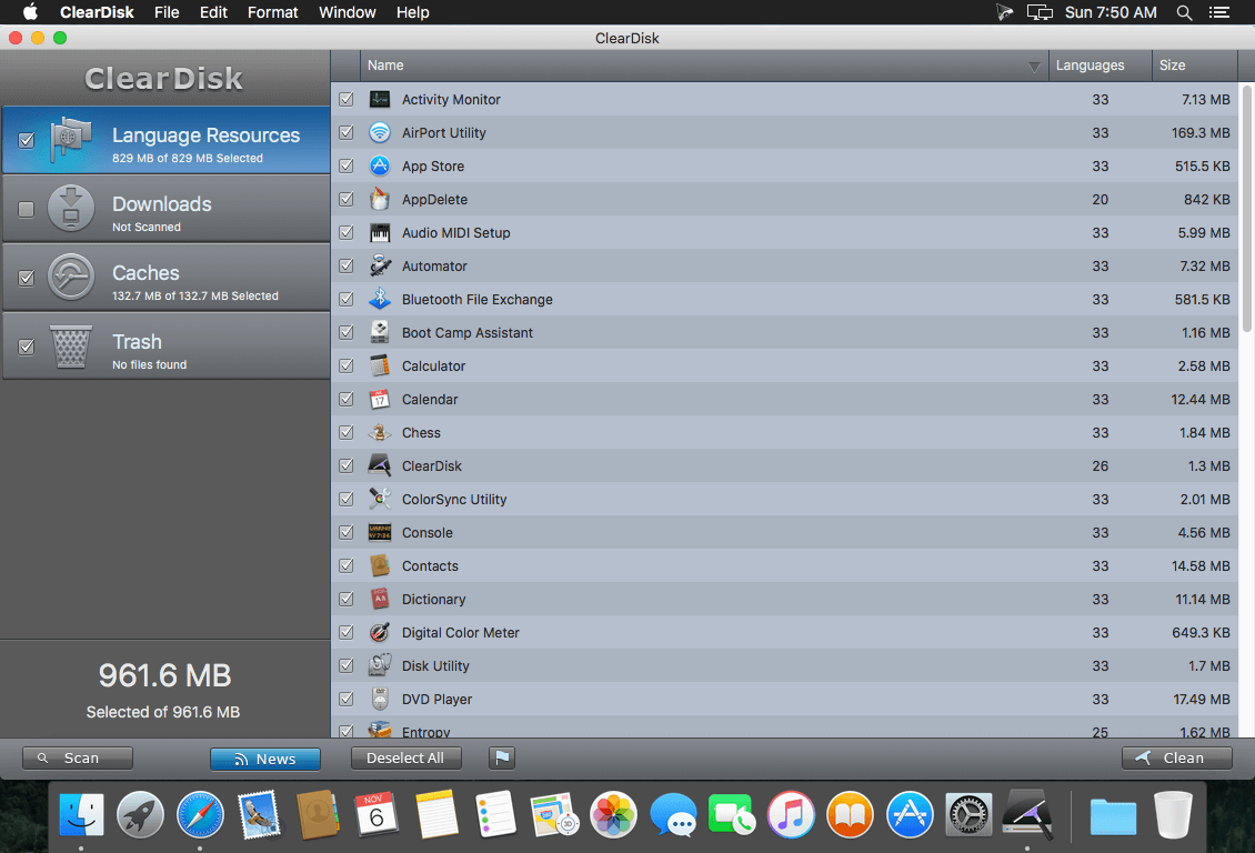 ClearDisk removes unnecessary localization files from Mac OS X, freeing up a large portion of space. - Downloads