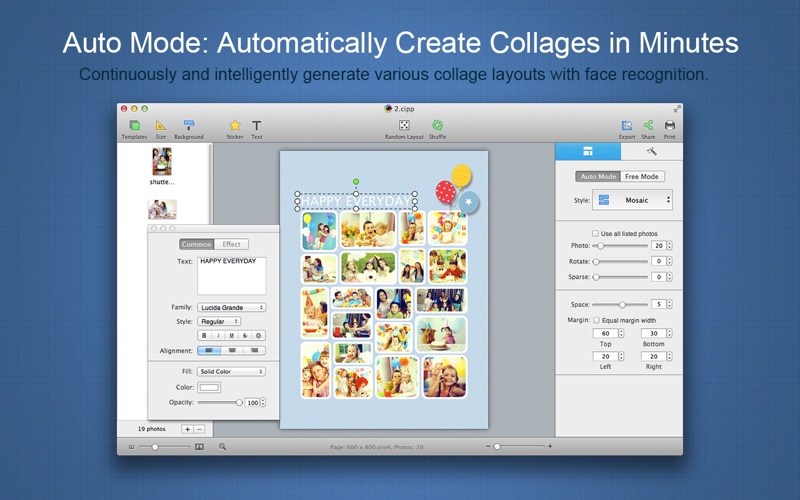CollageIt 3 for Mac is an easy-to-use and automatic app that helps create eye-catching photo collages on Mac OS X. It was designed to give everyone an opportunity to brighten up one’s photo collection, and in a few seconds, a set of photos will be turned into an impressive array of collages.