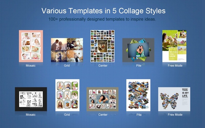 - Supports 5 collage styles: Mosaic, Grid, Center, Pile and Free Mode.