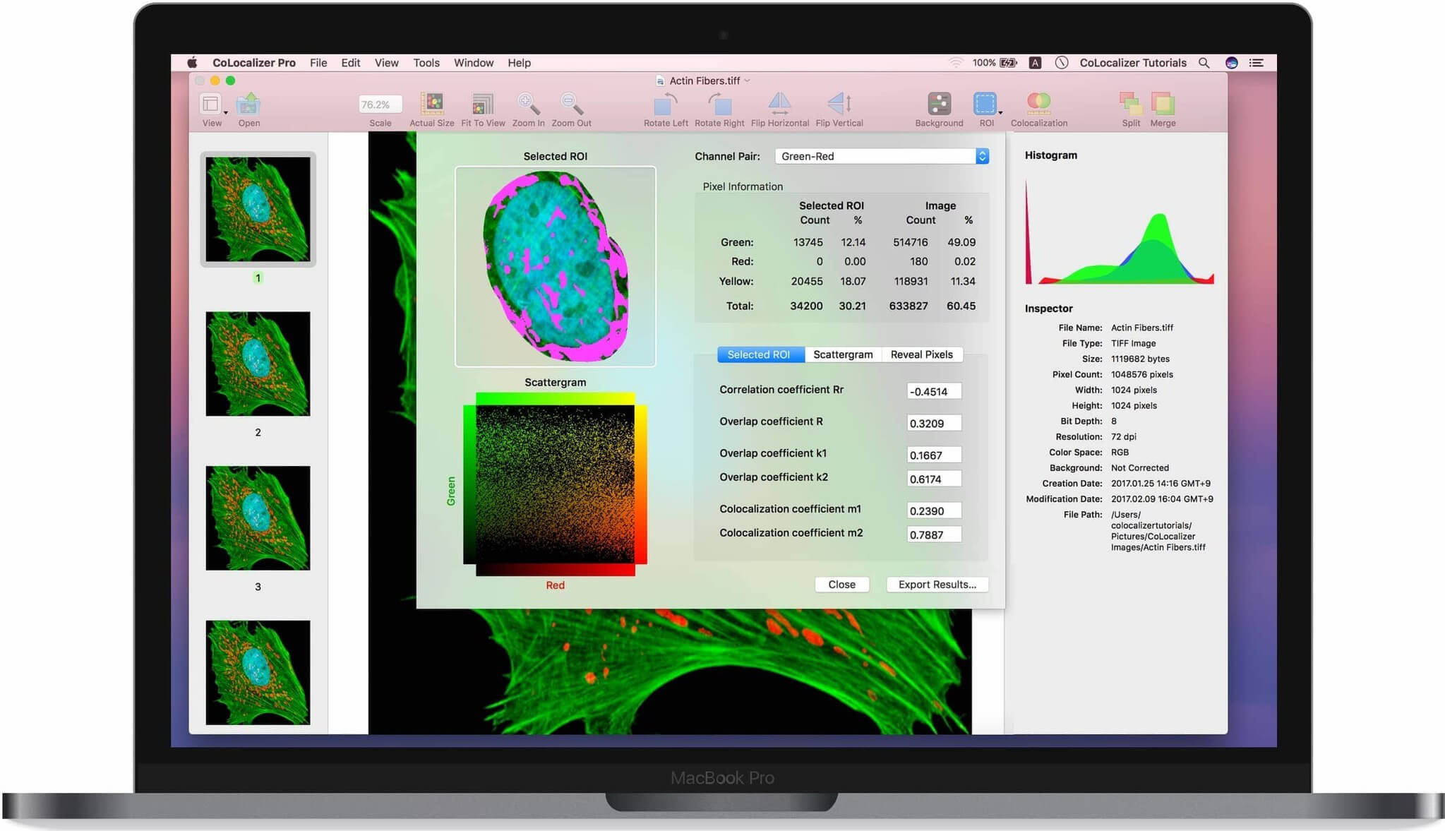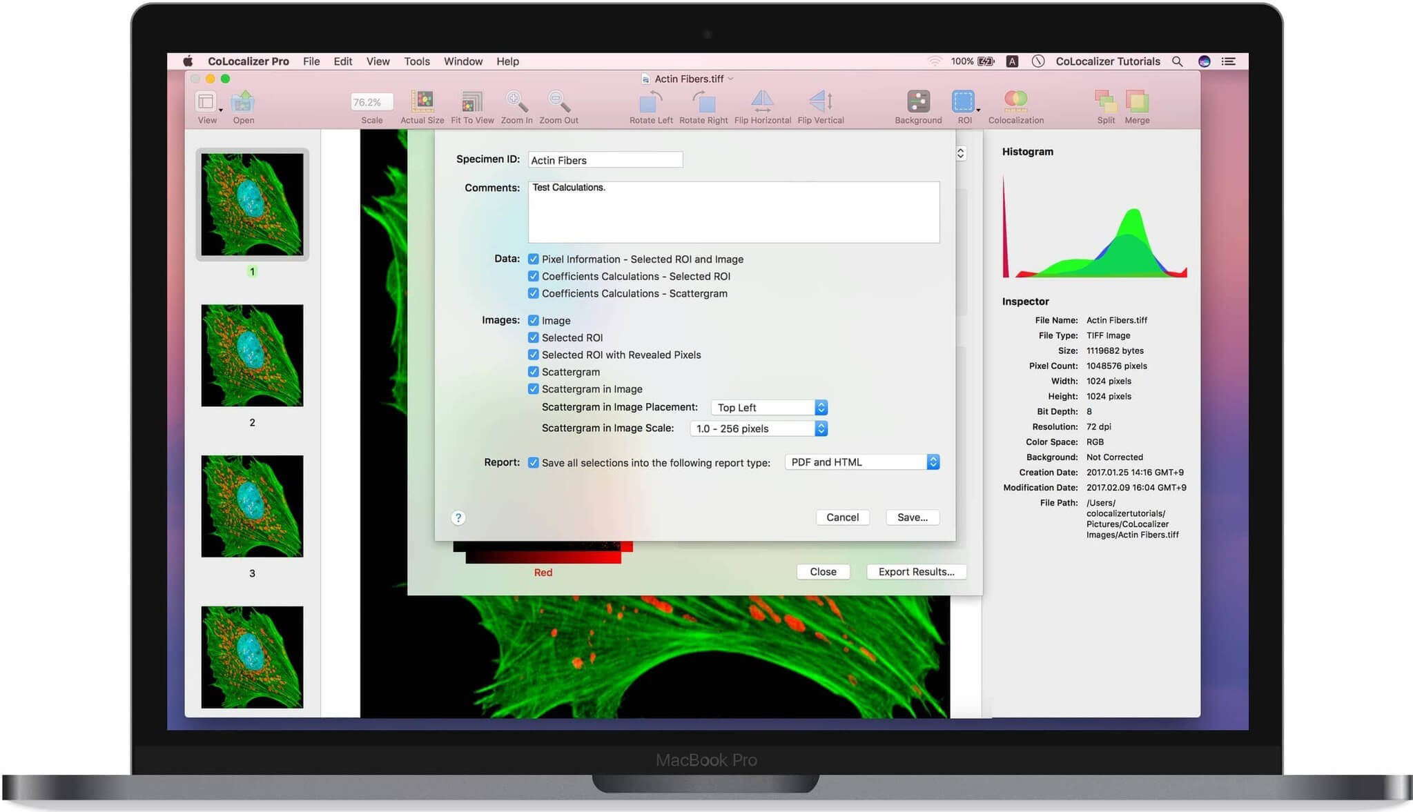 - Export results as colocalization reports with all the coefficients and image data stored conveniently in one place.