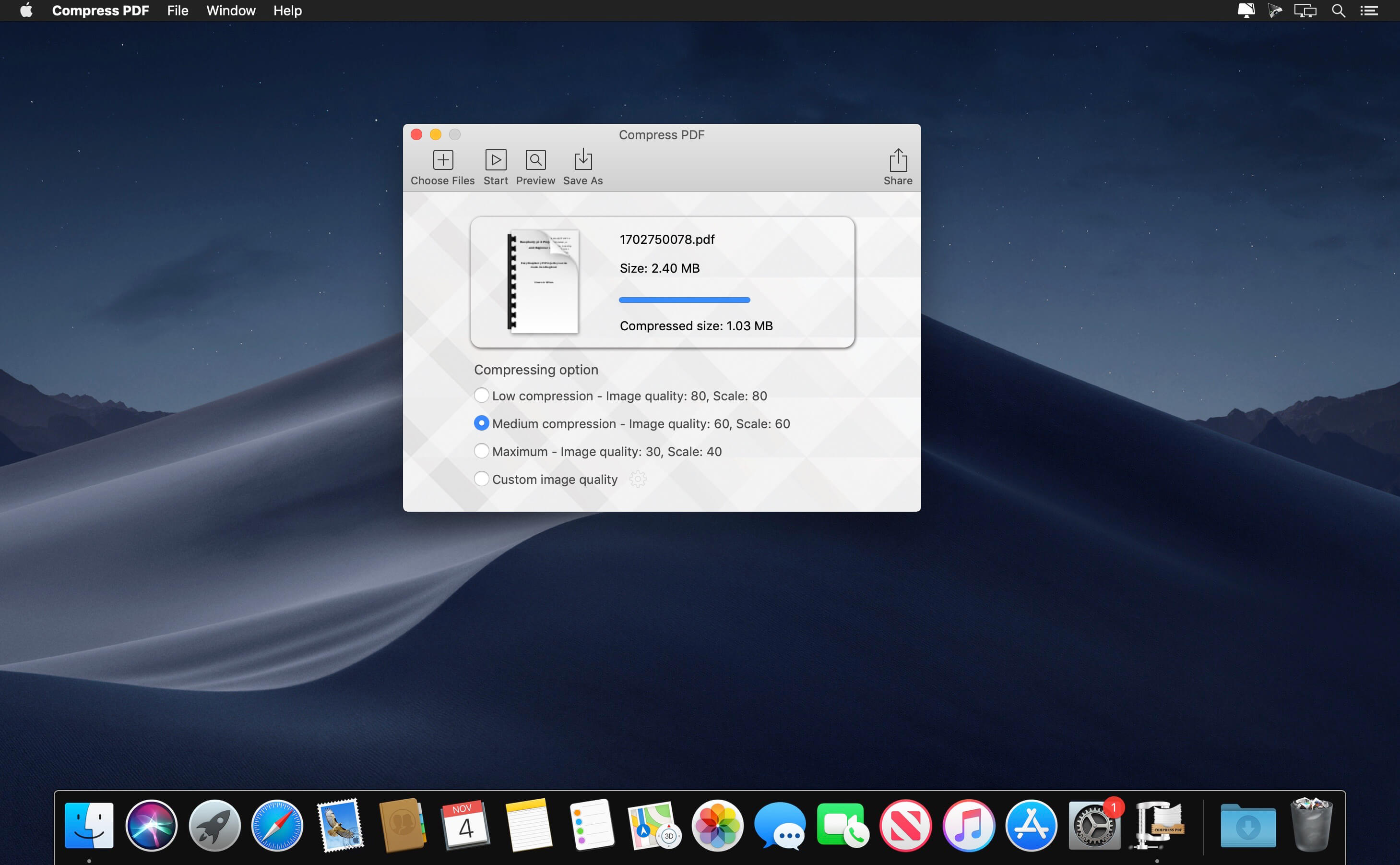 Compress PDF for Mac is a simple utility app that helps you quickly shrink PDF files, especially useful for those PDF files with many graphics and photos. It reduces PDF file size mainly by reducing the dpi of image and the graphic quality, and removing unnecessary data.