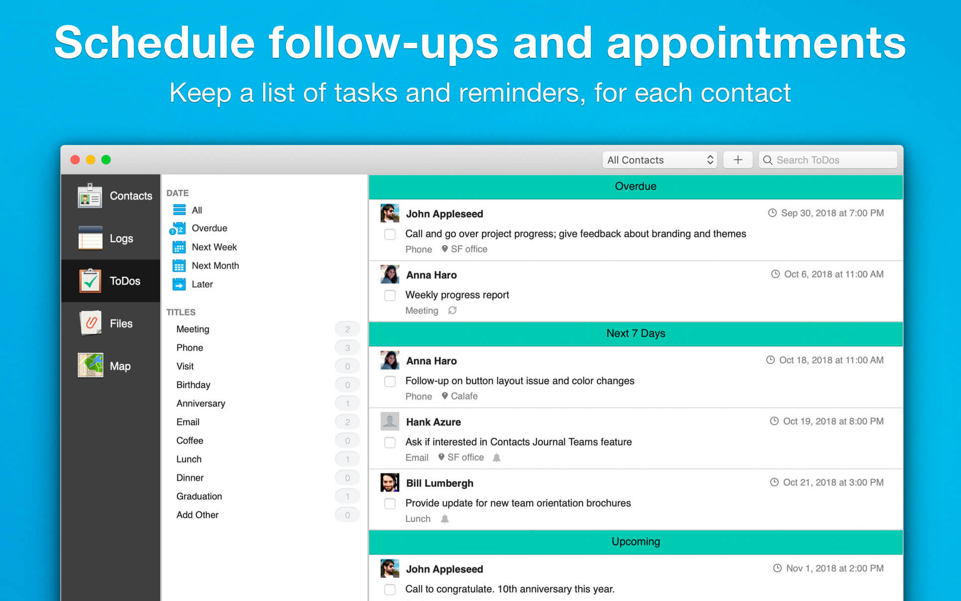 Contacts Journal is a powerful tool that will transform your business and personal relationships: save notes of important meetings, set follow ups and meetings, create custom contact fields, and attach important documents to each of your contacts. Available on the Mac, iPhone and iPad, with seamless iCloud syncing across all devices.