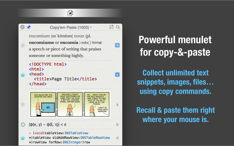 Copy’em Paste is a powerful clipboard manager for turbocharging your daily workflow. It records your clipboard history of copied text, images, links, and screenshots, etc., and lets you recall/paste them anytime, right at your fingertips. Use it to copy and paste items in batches (so minimizing switching between apps), capture screenshots and collect research data, store favorite clippings permanently, paste frequent snippets via keyboard shortcuts, strip text formats or transform text, organize clippings into different lists, sort and label them, look them up by keywords/types, preview and edit their text, and so on. All done with speed and reliability. It is a valuable time-saver that is both rich in features and easy to use!