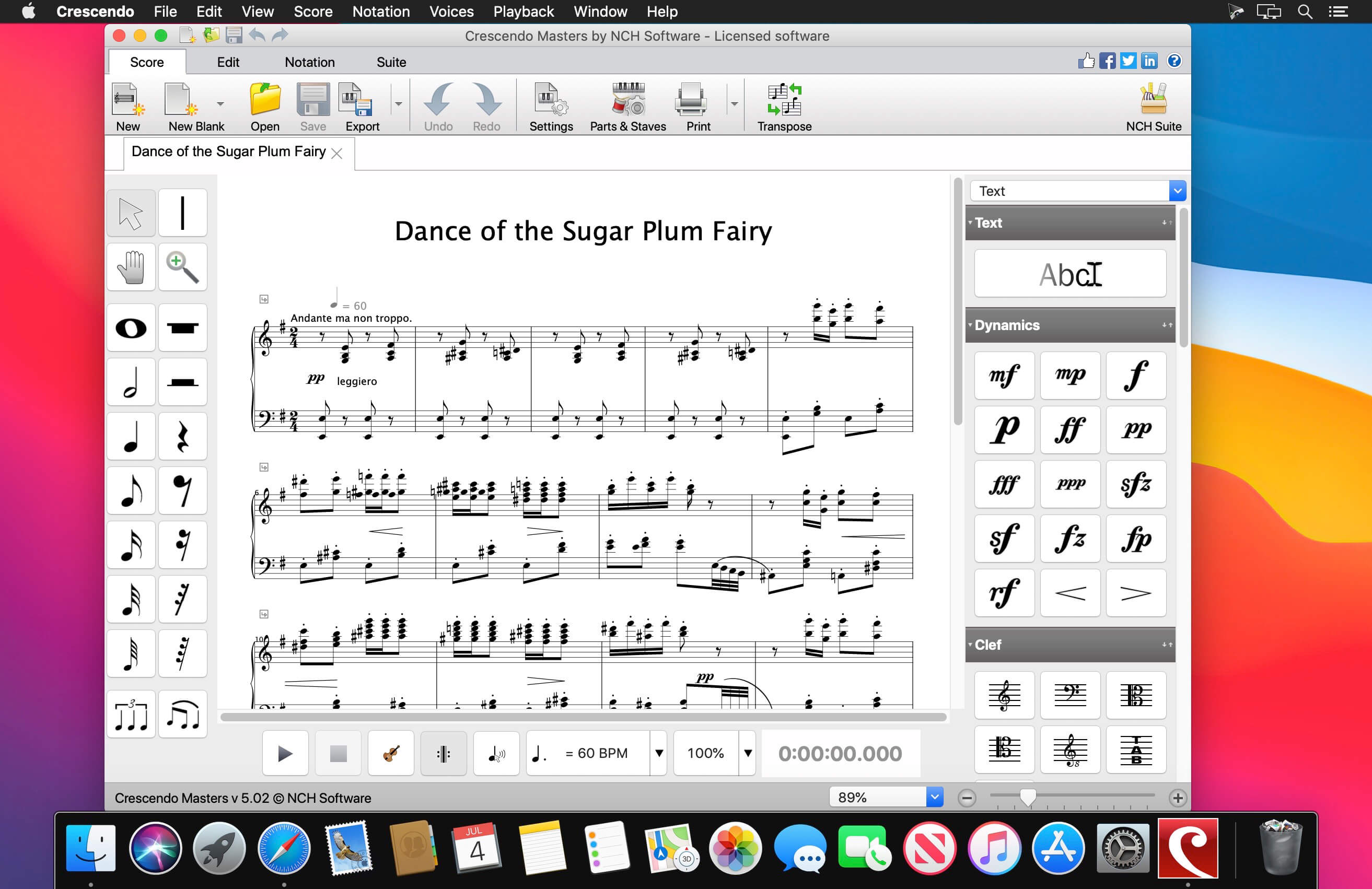 Crescendo Music Notation is the perfect software to start composing your music today. Using a free form sheet music layout, you can write your song, score, or composition your way. Create your arrangements with a variety of notation tools, where you can change the Dynamics, Clef, Key Signature, Time Signature, and more. Notes are easy to add and can quickly be transposed by key or by interval.
