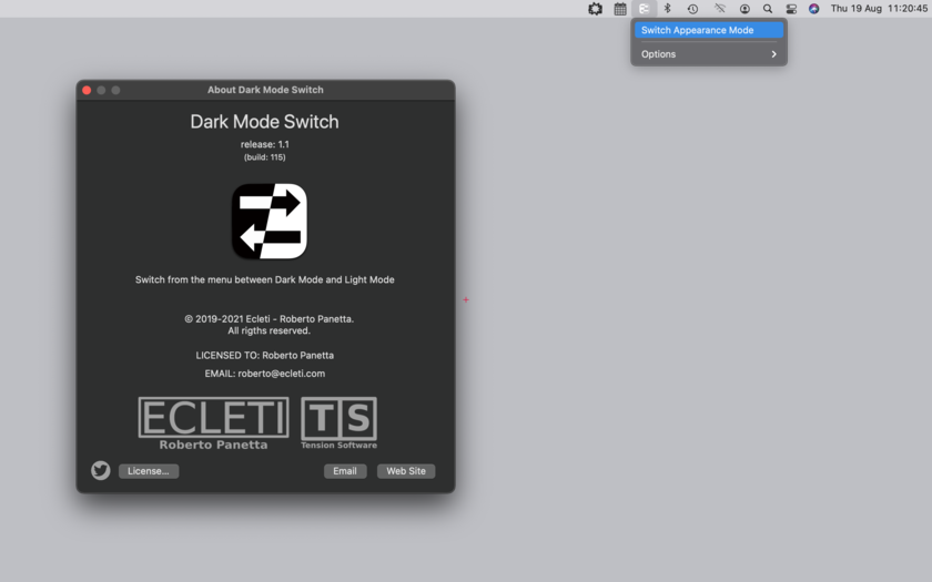 Dark Mode Switch allows to switch in a fast way from Light Mode appearance to Dark Mode appearance in a click.